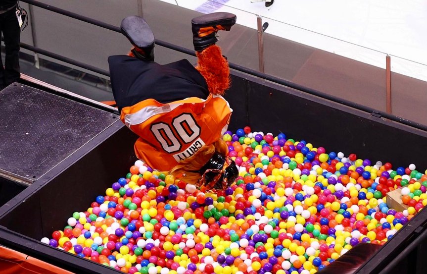 One of the benefits of having no fans in the building means Gritty had as much room as necessary to put together his stunts for the night, and he took that to heart on January 31 when he had his own personal ball pit installed. There’s something majestic about dolphins breaking the surface of the ocean just as there’s something majestic about a seven-foot, coked up muppet jumping out of a ball pit. He tried many different ways of dismounting into the pit, including a standing back tuck, something that surely would’ve won gold at the Olympics this summer. After he was done jumping for the night, he watched the rest of the game buried in the pit up to his googly eyes… waiting for his next victim to enter the pit with him.