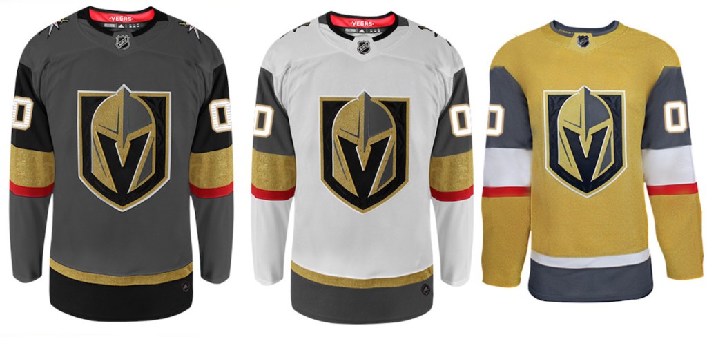 The simplicity mixed with outlandish ideas makes Vegas a great place for hockey jerseys. The toned down grey and white base with gold and red highlights for their home and away kits are quirky but work and their long awaited gold alternates are full on insane, but in a good way. Luckily we’re just judging the jerseys and not the helmets, because that would be a different story entirely.