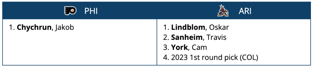 The first of two chychrun deals is probably fairly realistic when it comes to what the Flyers would have to give up. A top prospect in Cam York and a 2023 first round pick (the Flyers do not own the Avalanche’s first round pick, it was acquired in a separate deal for Giroux.) Sanheim gives them a left-handed defenseman on the roster and Lindblom serves mainly as a cap dump in this case, but considering the Coyotes only have five forwards under contract next season, he’d help fill out their roster too.