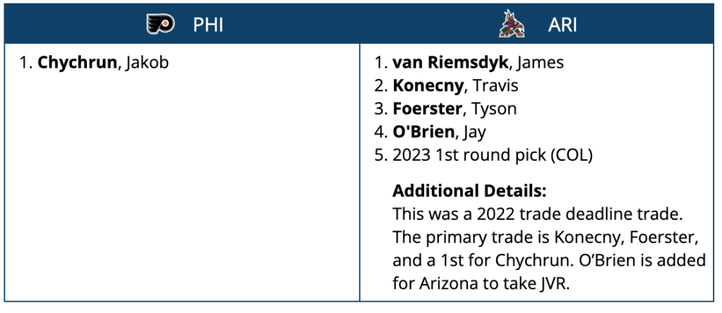 The second Chychrun trade is far more insane, with, as the trade creator describes, a salary dump and a major trade all wrapped into one. The Flyers dump the last year of JVR’s $7 million contract and acquire Chychrun and it costs them Travis Konecny, prospects Tyson Foerster and Jay O’Brien and a 2023 first round pick.