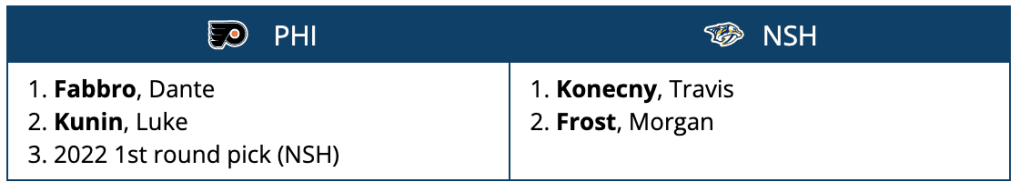 This would be a deal in which you’d squeeze the absolute most out of Travis Konecny while hoping Morgan Frost has any perceived value across the league. Even though the 23-year-old defenseman Dante Fabbro is still very much in Nashville’s long-term plans, he hasn’t quite lived up to the lofty expectations set for him when he entered the league. Kunin was a former first round pick in 2016 and has settled into the Predators’ middle six forward group, though he’s got slightly underwhelming offensive numbers with just 11 goals and 19 points in 59 games this season.