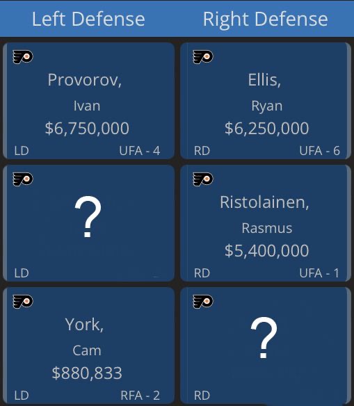 This could also be a weird offseason that sees one of Provorov or Sanheim be traded and maybe Attard isn’t viewed as NHL ready quite yet and we get a lineup that has 2 question marks on the bottom pair. This could result in a lineup on opening night of: