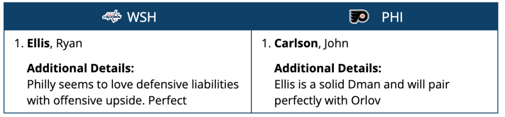 This deal was proposed by a Caps fan, so I’m not quite sure if they realize the level of PTSD Flyers fans get when the name John Carlson is thrown out there, but here we are. Now 32 years old, Carlson has reached the point of his career where he’s no longer as effective as he used to, but he’s finished top-five in Norris voting in three of the last five seasons. He’s got 16 goals, a new career high, and 70 points this season in Washington. Carlson has four years left at an $8 million cap hit.