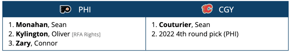 In yet another attempt to clear Sean Couturier’s contract off the books before it’s too late, this time he gets shipped to Calgary in exchange for 27-year-old Sean Monahan, who has one year left at a $6.3 million cap hit and 25-year-old defenseman Oliver Kylington, who is a pending restricted free agent in the middle of a breakout season with nine goals and 31 points in 71 games. Connor Zary was the Flames first round pick in 2020 currently playing his first season in the AHL where he’s got 13 goals and 25 points.
