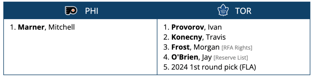 Marner, 25, is in the middle of a career year with a 35-goal, 97-point campaign. He’s got three years left at a $10.9 million cap hit. For the Flyers, Provorov and Konecny would cover the financial cost of the deal. Morgan Frost would provide a cheap depth forward with a potential higher ceiling playing with elite forwards. Jay O’Brien was the Flyers’ 2018 first round pick who has struggled to make a name for himself in the years since. The Flyers also surrender their 2024 first round pick, the one the received in the Claude Giroux trade.