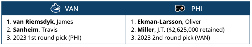 OEL five years left at $8.25 million. Miller has one year left at $5.2 million, but in this scenario would only cost $2.6 million as Vancouver would retain half of the last year of his contract. Both JVR and Sanheim’s current contracts are set to expire in the 2023 offseason.