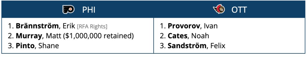 In this scenario, the Flyers manage to keep their first rounders in 2022 and 2023 as well as top prospect Tyson Foerster. They get a top NHL caliber player in exchange for all their second-tier trade assets.