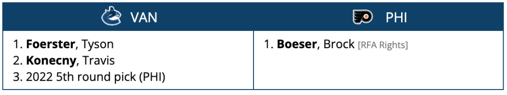 A longtime theorized trade between the Vancouver Canucks and Philadelphia flyers has been Boeser for Konecny, but this time, it has a kick- rather than an even swap, the Flyers have to pay up for the better player.