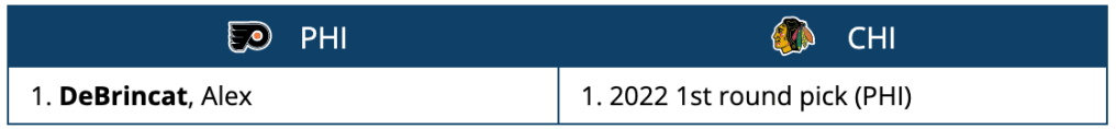 Rumor has it the Blackhawks are listening to offers on Alex DeBrincat, and that team’s are asking to part ways with their top pick in the 2022 NHL draft. The Devils are apparently willing to deal the second overall pick, meaning the Flyers would need to match by giving up their fifth overall selection. There’s a good chance in reality the Flyers would need to seriously add to this offer, but in this scenario it’s as simple as the fifth overall pick for 24-year-old two-time 40-goal scorer Alex DeBrincat.