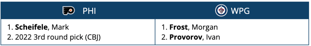 The straight-up price for Scheifele is going to be an interesting option for the Flyers, given he may be high on their list for a potential center addition. In this scenario, it would cost them forward Morgan Frost and defenseman Ivan Provorov.