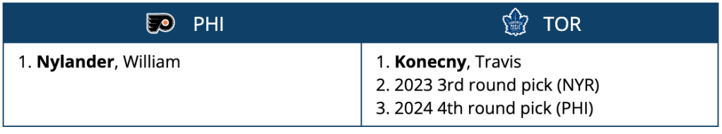 The Flyers get an upgrade at wing and the Leafs get a bit of salary relief for a slight downgrade, plus a pair of mid-round picks to make up for the difference.
