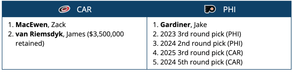Flyers retain half of JVR, eat the last year of Gardiner, who surely won’t be the player he once was, but in return get a flurry of draft picks, including two picks they originally gave up in the Tony DeAngelo trade.