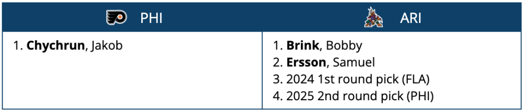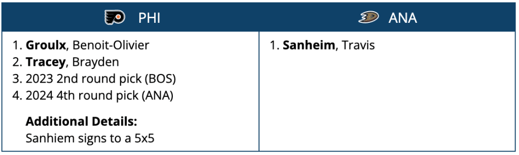 The Flyers get a cocktail of picks and prospects for their pending UFA at the 2023 trade deadline, and the Ducks get a puck-moving defenseman to compliment their young, speedy forwards corps.