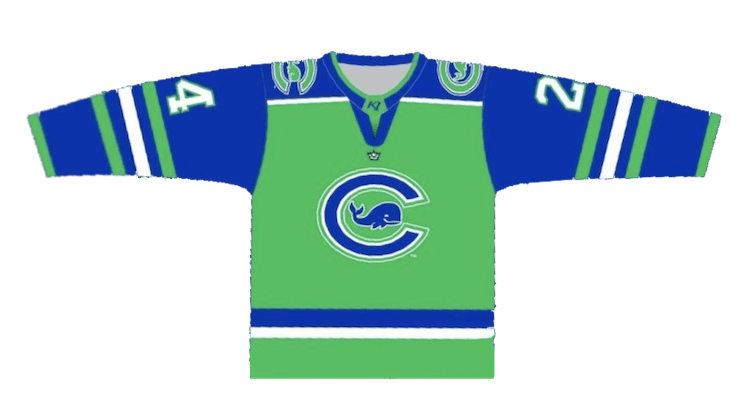The green, blue and white color scheme the Whale deploy can be lead to a very loud hockey jersey. The green base is certainly a bit more visually pleasing than the blue jerseys, but the same complaint can be had for these as well; why get rid of all the cool stuff?