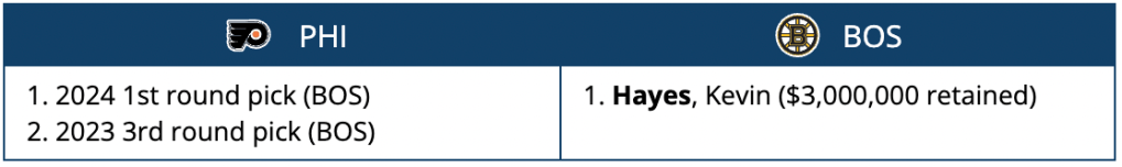 This scenario may not be as flashy or based around high-end talent like the others on this list, but it’s a deal that could very well happen in real life this summer. If the Flyers want to have enough cap space to make any impacts in 2023 free agency, they will first have to shed a bit of salary, and 31-year-old Kevin Hayes would be a prime player to move. In this scenario, the Flyers would retain $3 million of his $7.1 million cap hit for the remaining three years on his contract.