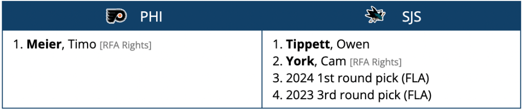 Cam York is probably the Flyers’ best trade chip at the moment as their top prospect who can’t find himself an NHL role, and Tippett is having a decent season, but Meier is a more than decent upgrade. The Flyers would give up one of their two first round picks in 2024 and a third rounder in 2023, both acquired in the Giroux trade.