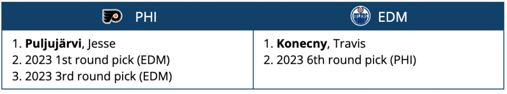Puljujarvi’s stock has dropped tremendously this season and may no longer be a project worth taking on, but an additional first and third round pick in 2023 may make up the difference. Though if the Flyers actually part ways with Konecny, do they look for a bigger return given his point-producing season?
