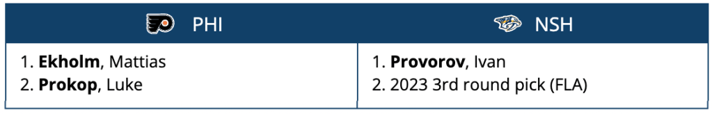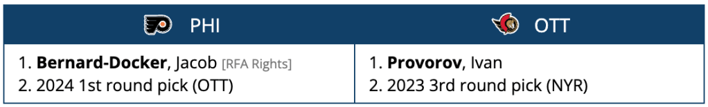 The Flyers get a top right-handed defense prospect and a first round pick in next year’s draft in exchange for Provorov and a third rounder in 2023.