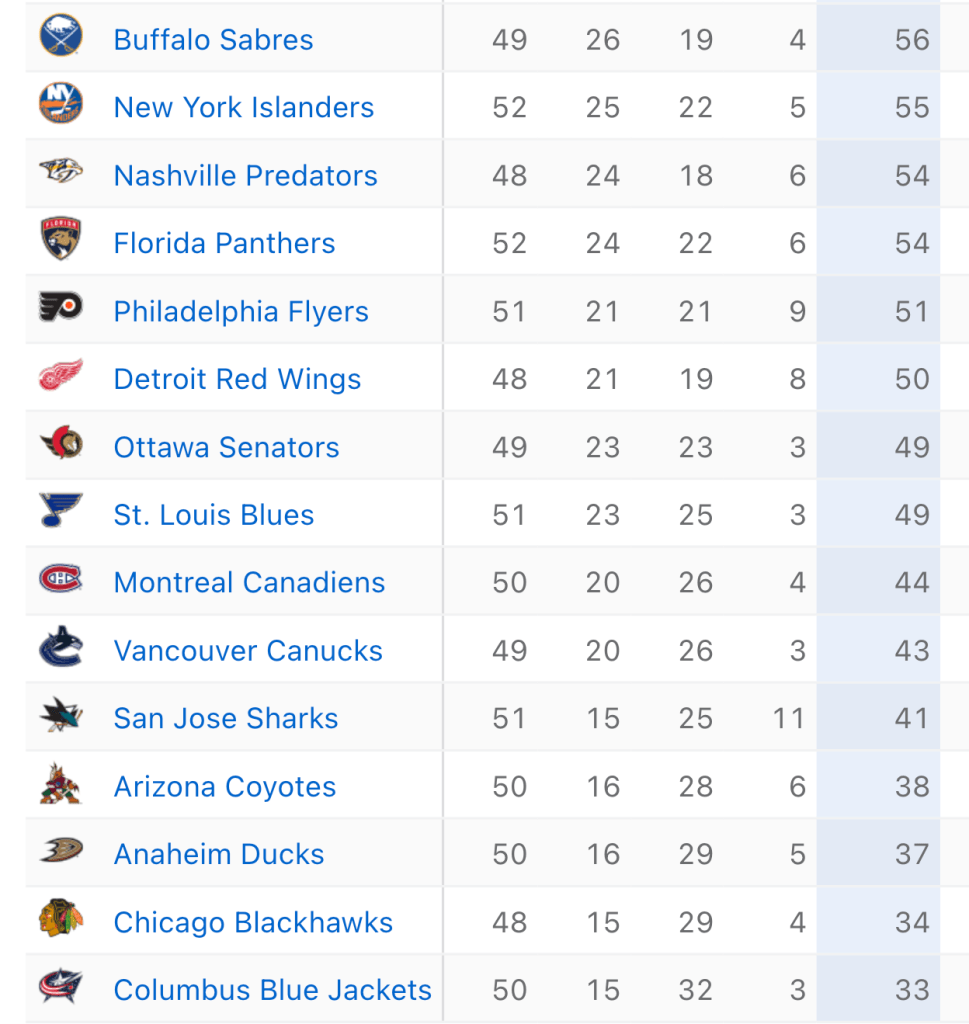 As you can see the pack is starting to sort itself out. The basement teams have fallen so far back at this point that the bottom four teams are now in the main battle for Bedard. The Sharks, Canucks and Canadiens can still swing either way, but soon they’ll be out of reach as well. Then there’s the Blues, Senators, Red Wings and Flyers, who will fight for the best (worst?) positioning as the teams who aren’t good enough to make a run at a playoff wildcard spot.