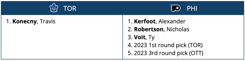 The Flyers get two young forwards back as well as two draft picks in 2023 and the Leafs add a gritty forward to their playoff run.