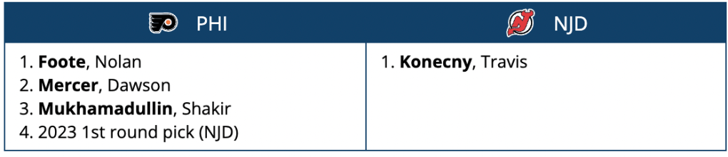 If you’re trading a player of Konecny’s caliber to their rivals up the turnpike, they better pay a premium for it, and that’s exactly what this scenario suggests as a pretty heavy drain on some of the Devils’ top prospects.