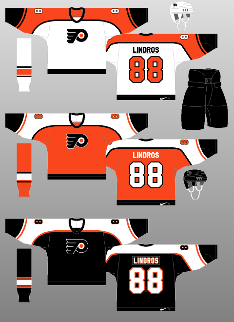The original complaint from a bulk of the fanbase was the lack of black piping along the sleeves and shoulder yoke separating the orange and white. When seen in this form, it feels more forgivable than in the original Chris Creamer mock-up when he photo shopped old pictures of Lindros and LeClair.
