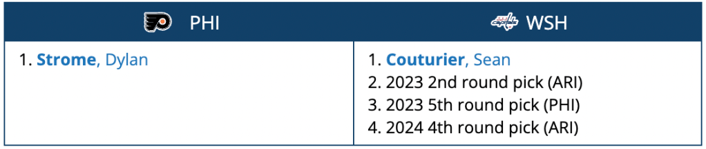 The Caps take a risk acquiring the injury-riddled Couturier to attempt to keep the team afloat during the last years of Alex Ovechkin and the Flyers get a younger center that is on the rise and fits the age range of the current team significantly better than Couturier.
