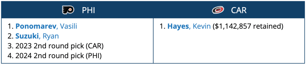The Flyers get an extra 2023 first rounder plus an exciting forward prospect and the Leafs get a very solid middle six center to continue their Cup aspirations.