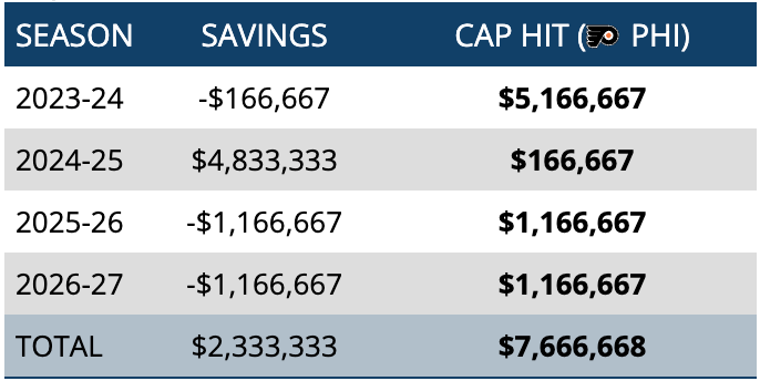 The Flyers did this one to themselves. They voluntarily added the guy. It’s highly unlikely they buy him out this summer, but if he can’t work his way back into the NHL picture during the season, they could reconsider a potential buyout in 2024, which would only cost the team $1 million in 2024-25 and $2 million in 2025-26.