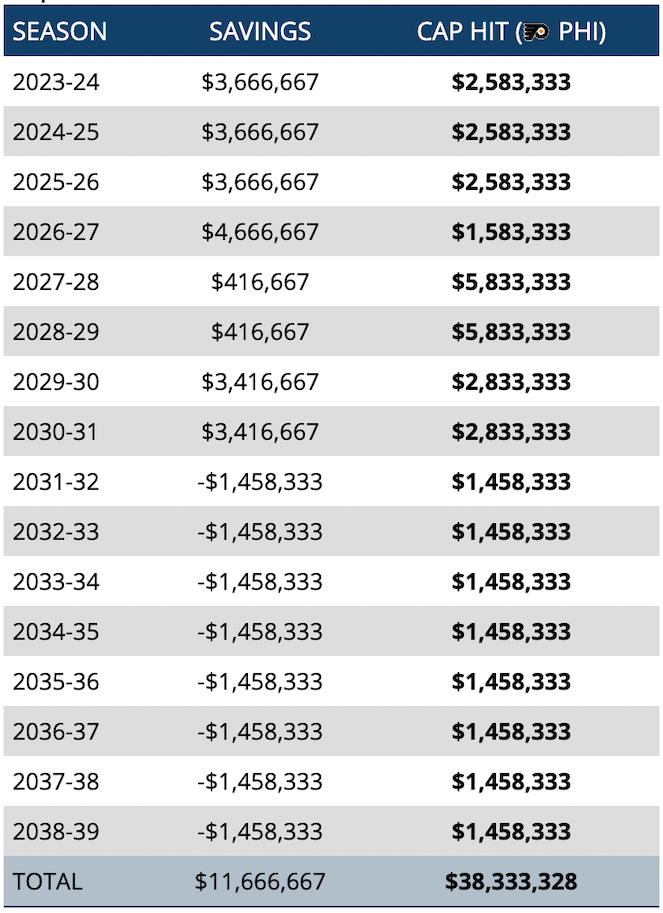 The regret lives large, but a buyout is a nuclear option. The cap hit per season actually isn’t that bad all things considered. The big problem is the $5.8 million knock from 2027 to 2029, right around the time the Flyers should be entering “go time” and will need every dollar to ice a competitive team.