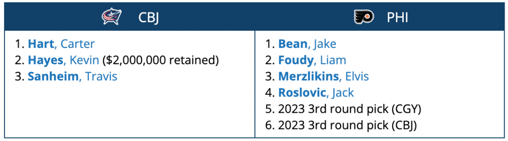 The Flyers would then hold the fifth and seventh overall picks, as well as 22nd overall previously acquired in the Provorov trade in the stacked 2023 entry draft.
