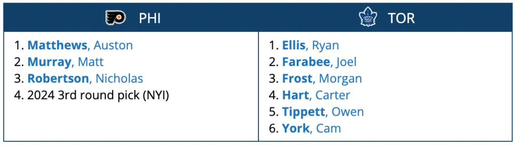 Worth noting, the Flyers do not own the Leafs’ 2024 3rd round pick in real life, it was added from a separate trade in his scenario, but the Flyers do own their own third rounder in 2024, so that can be subbed in instead.