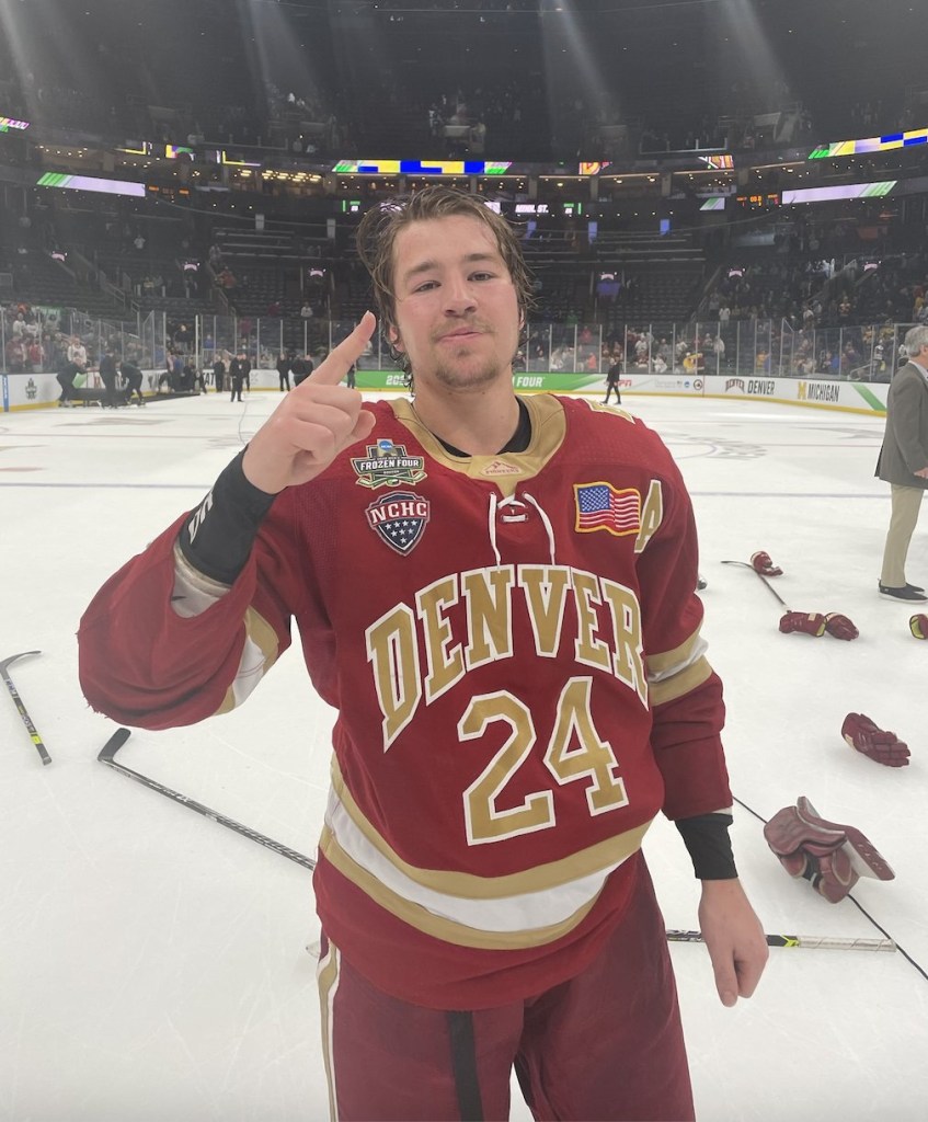 In just his second year in College he improved off of a strong rookie season. Leading Denver in points, scoring 17 goals with 29 assists and 46 points in 38 games. In 2022-23 he had a lot of improvement, despite already finishing on the podium among Denver freshmen with 36 points (12g/24a). This past season lowered his penalties, increased shot totals, more ice time on the power play, and scored more, obviously.
