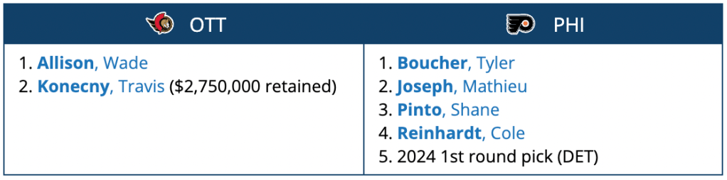 The Flyers get a promising young center and a first round pick for Travis Konecny (at 50% retained for this season and next) plus a pair of forward prospects for Allison, who is possibly an odd man out of the current team.