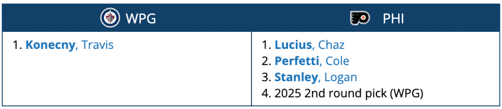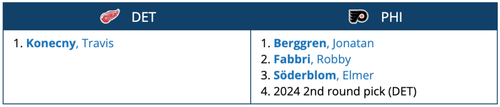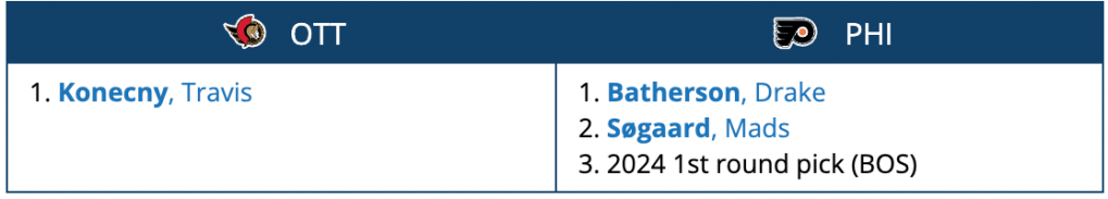 The Flyers get a similar (albeit slightly lesser) player to TK, a closer to NHL-ready goalie prospect as well as a first round pick in exchange for Konecny.