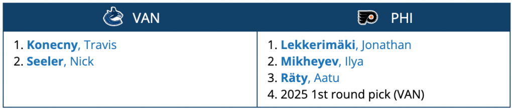 The Canucks are looking to go all-in on a Cup run this season, so it makes sense they’d want to add another higher end forward to their mix. A top forward prospect and a first round pick in next year’s draft highlight this package.