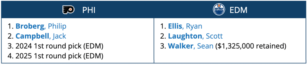 Some of the best scenarios to stem from this series are deal that seem crazy at face value, but actually have a fair bit of logic within. The cap-strapped Oilers would get to put Ellis on IR rather than carry the cap hit of Campbell. Then, say, Broberg-for-Laughton and Walker-for-First round pick, means the Flyers would get a bonus first to eat the rest of Campbell’s deal.