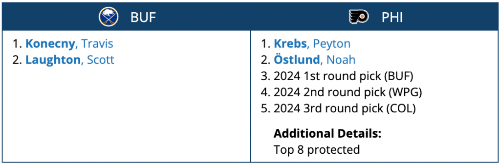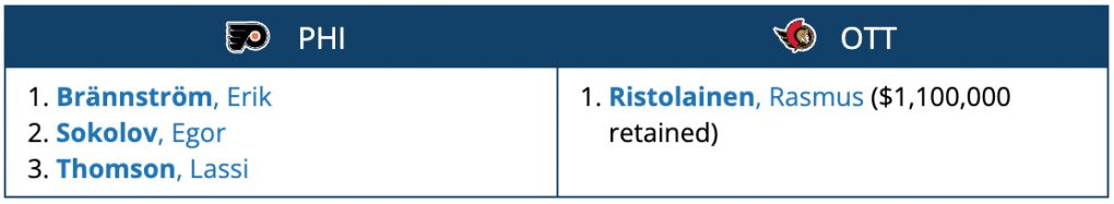 Ristolainen has three years left on his deal at a $5.1 million cap hit, so a $1.1 million retention drops his hit to $4 million. The Flyers get a bunch of misfit prospects in exchange for eating part of Ristolainen’s contract.