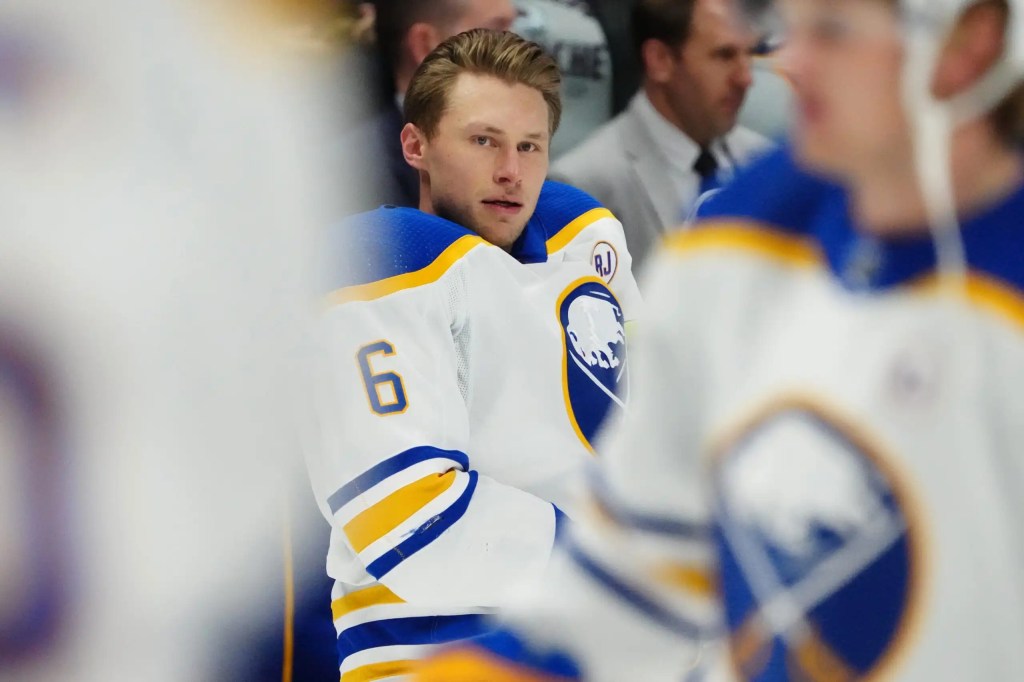 Dec 13, 2023; Denver, Colorado, USA; Buffalo Sabres defenseman Erik Johnson (6) before the game against the Colorado Avalanche at Ball Arena. Mandatory Credit: Ron Chenoy-USA TODAY Sports