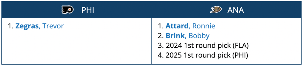 In this scenario, the Flyers give up slightly less contracted talent in exchange for upping the draft capital. Attard has been the odd man out on the Flyers’ blueline for years, but has had a decent amount of success in the AHL, while Brink made the main roster out of camp, but has seemingly fallen out of favor with Tortorella. Rather than just wasting prospects in the AHL, package a few of them together to a rebuilding team to acquire a top talent.
