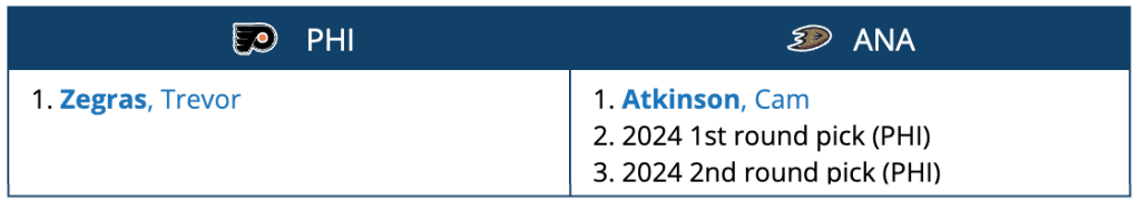 This one is essentially a slightly more reasonable version of the previous one. The Flyers use Farabee as the target, whose trade value is significantly higher than Atkinson’s, but his $5.5 million cap also is about equal to Zegras’. The Flyers part ways with the 31st or 32nd overall pick as well as the *potential* 36th overall pick in 2024 (CBJ can move it to next year as a condition of the original trade).