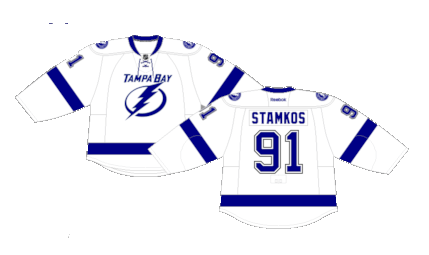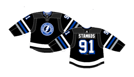 The Bolts newest jerseys are admittedly pretty damn clean. The three different colored stripes on the sleeves and two-tone numbers look great. The crest is the same design that has adorned their shoulder yoke for years. All in all a very cool jersey that would benefit as the basis for a complete home and away makeover.