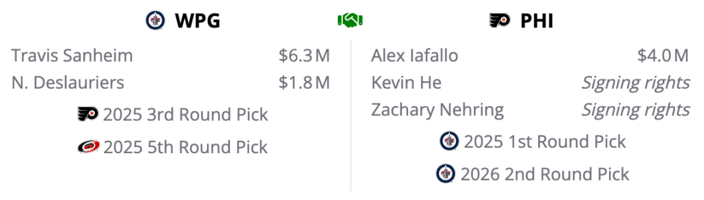 The Flyers clear $8.1 million in cap for the 2025-26 season (and $6.3 for the remaining six years of Sanheim’s deal) and they get a first and second round pick to do it.