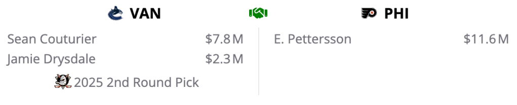 What would Vancouver want with the reanimated corpse of Sean Couturier and whatever it is Jamie Drysdale does these days? And why would they trade 100-point forward Elias Pettersson for them? We’re not here to ask questions, we’re here to present the trade.