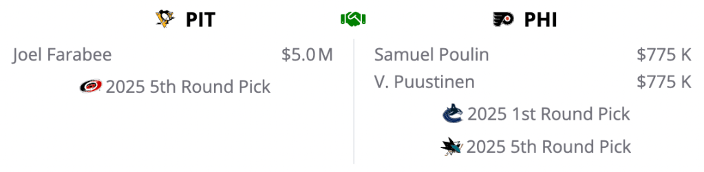 If the Flyers are going to have to dance with the idea of trading Joel Farabee sooner or later, this is an intriguing way to do it. Two decent forward prospects as well as a first round pick in 2025.