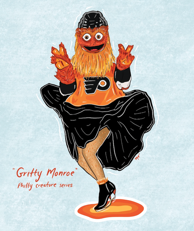 It’s the crossover you didn’t even know you needed- Gritty and Marilyn Monroe! You can get this one-of-a-kind art in print, keychains and stickers!
