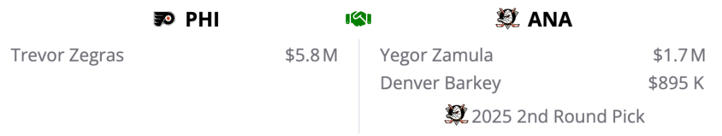 Zegras has one year left on his current contract at a $5.75 million cap hit. He has just seven points in 19 games during the 2024-25 season, but has 161 points in 230 total games.