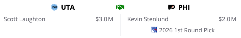 The Flyers get a slightly younger depth center (Stenlund is 28 vs Laughton who will turn 31 in the spring) at a lesser cap hit (Stenlund has one year left on his deal, Laughton has two) and pick up a first round pick to do it.