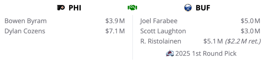 The Flyers retain just shy of half of Ristolainen’s cap for the next two years, but that makes the money almost even in this deal.