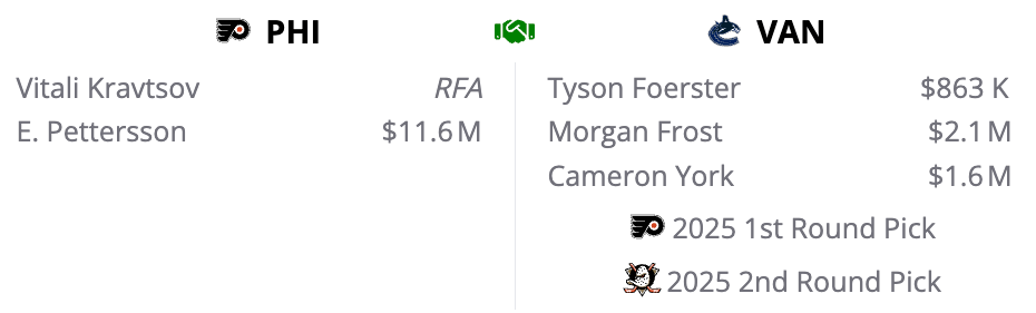 In the world of making a realistic trade for Pettersson, this is pretty close to the best the Flyers could do. The author did note the Flyers’ 2025 pick in top three protected, something they probably wouldn’t have to worry about unless they win the lottery.